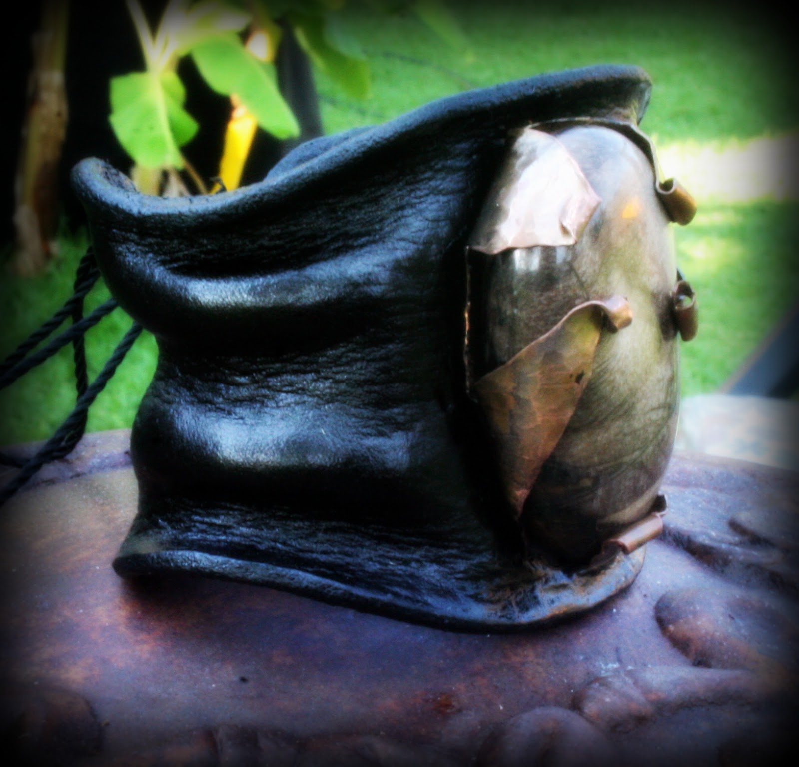 This cuff is wet formed leather and has been sealed to maintain it's shape. It has a huge tumble polished stone mounted in the center of the leather. This is a very unique one of a kind piece. With the eyelet trim and the cording, it resembles a corset, that is why I call it a corset cuff. This cool cuff/bracelet is up for purchase on Etsy.