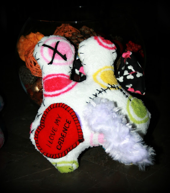 Well, I finished Addy's Birthday Present and was about get it ready for it's trip to Louisiana when I realized that I couldn't send it off with making Cadence a little sumpin' sumpin', you know, how disappointed would she be when Addy gets a package in the mail and she didn't. So, I made, heck, I don't know what I made, but, It states clearly on it's butt that it loves Cadence and lo and behold, it can ride a Unicorn Zombie.